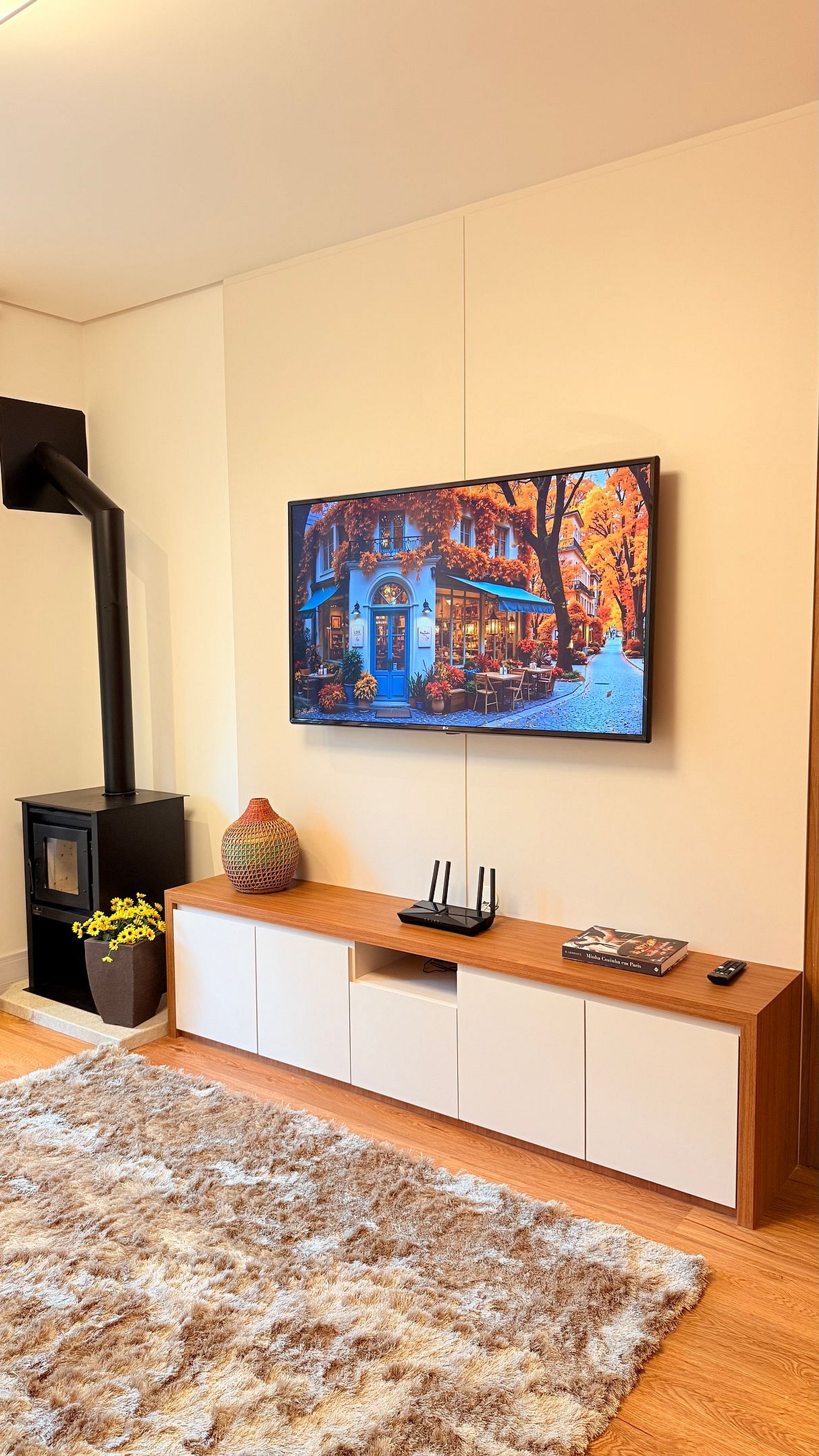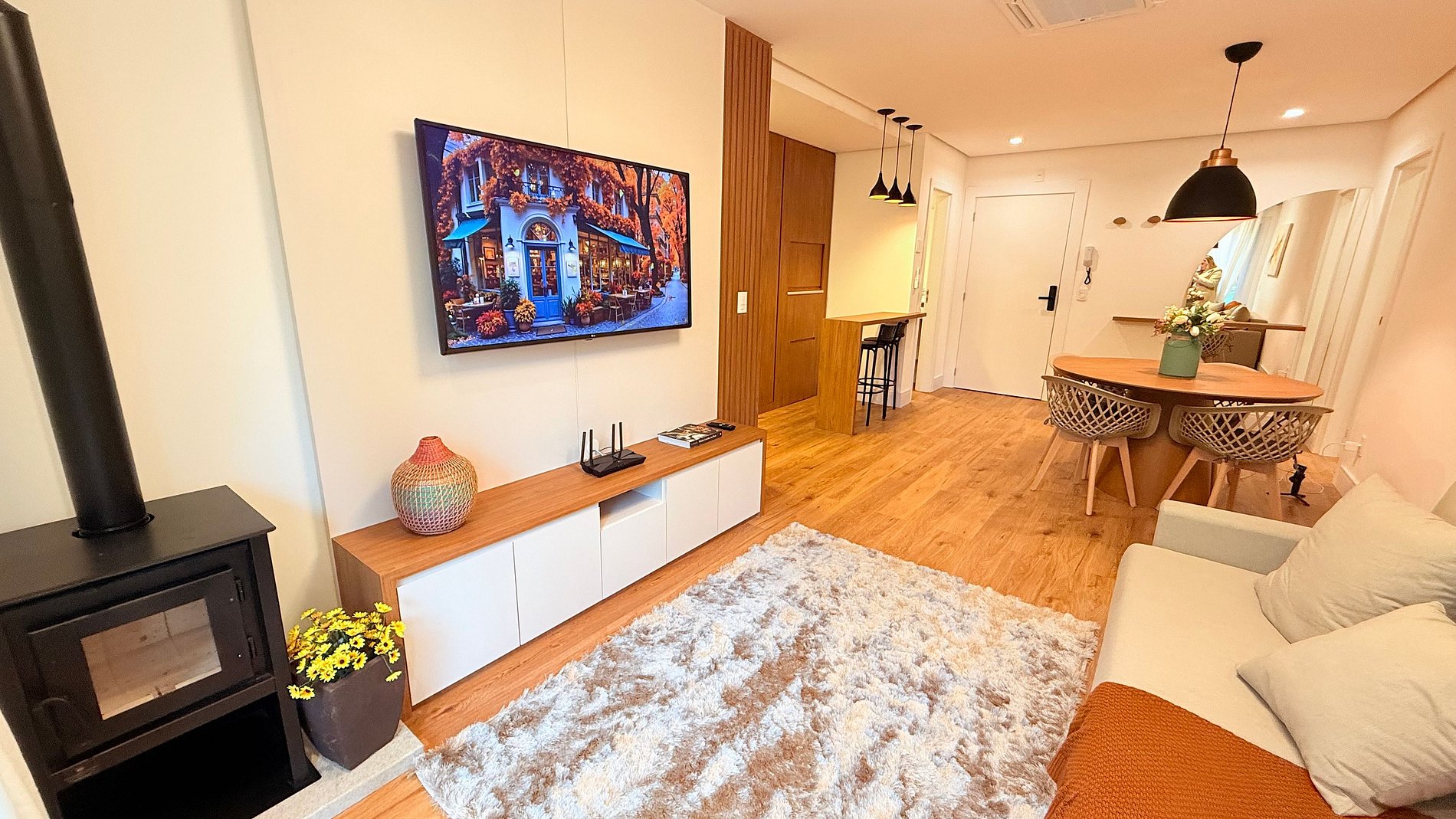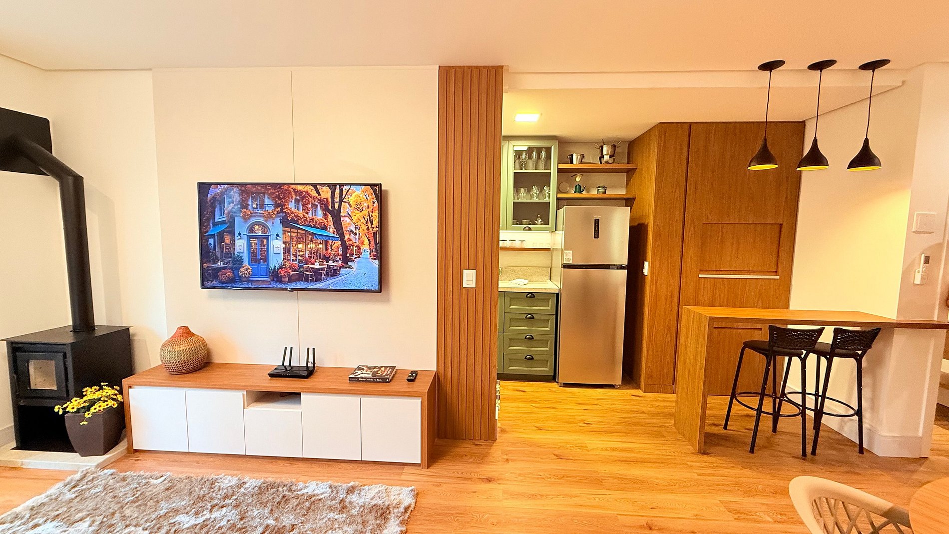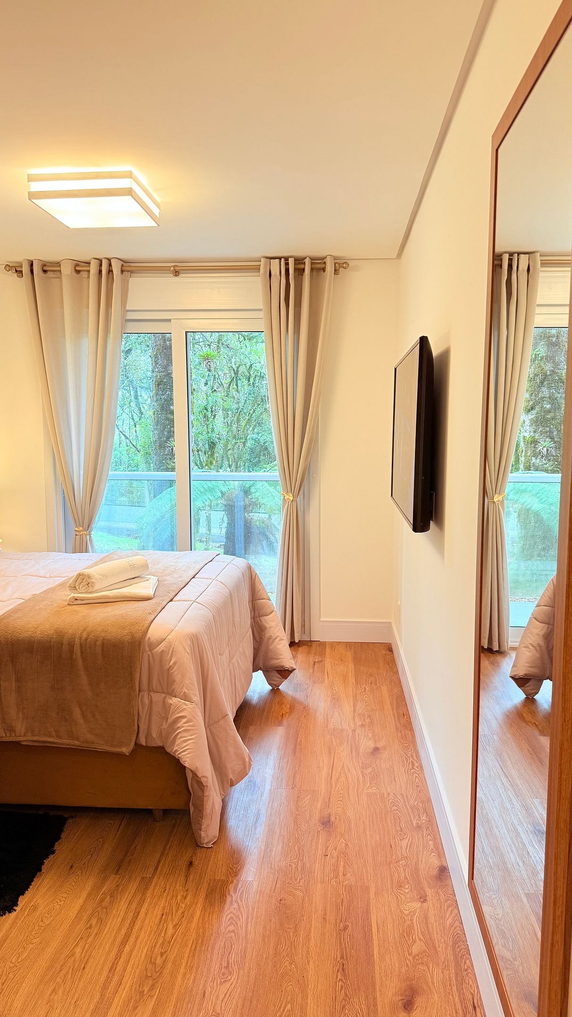 Esse apê é um refúgio perfeito em meio à natureza de Gramado. A ampla varanda com vista para o verde convida a momentos de paz e contemplação. A lareira e o sofá-cama tornam a sala ainda mais acolhedora. A suíte é confortável e climatizada, com cama queen e ar-condicionado. Tudo foi pensado para unir conforto, praticidade e beleza — dentro de um condomínio clube com lazer completo, ideal para todas as idades.