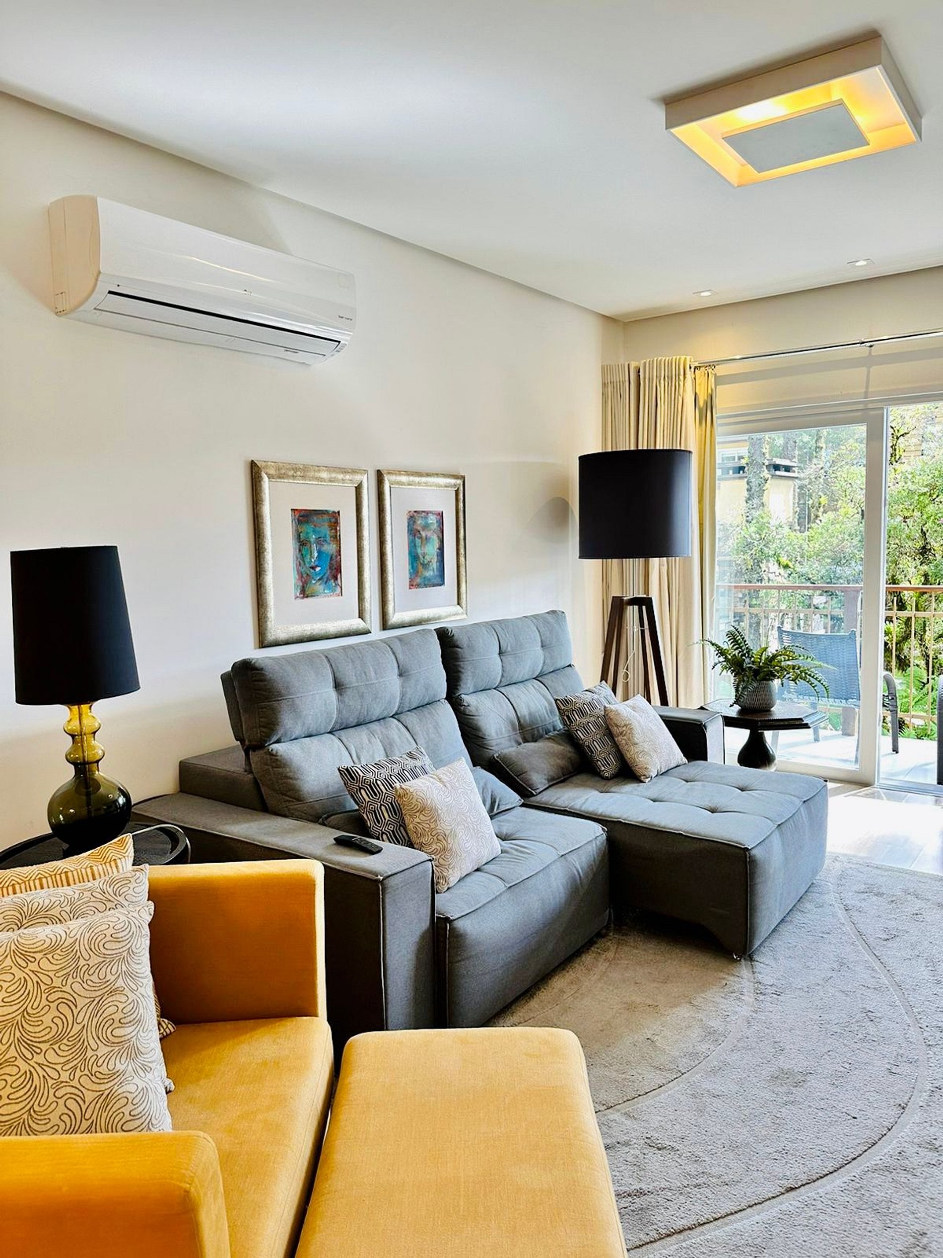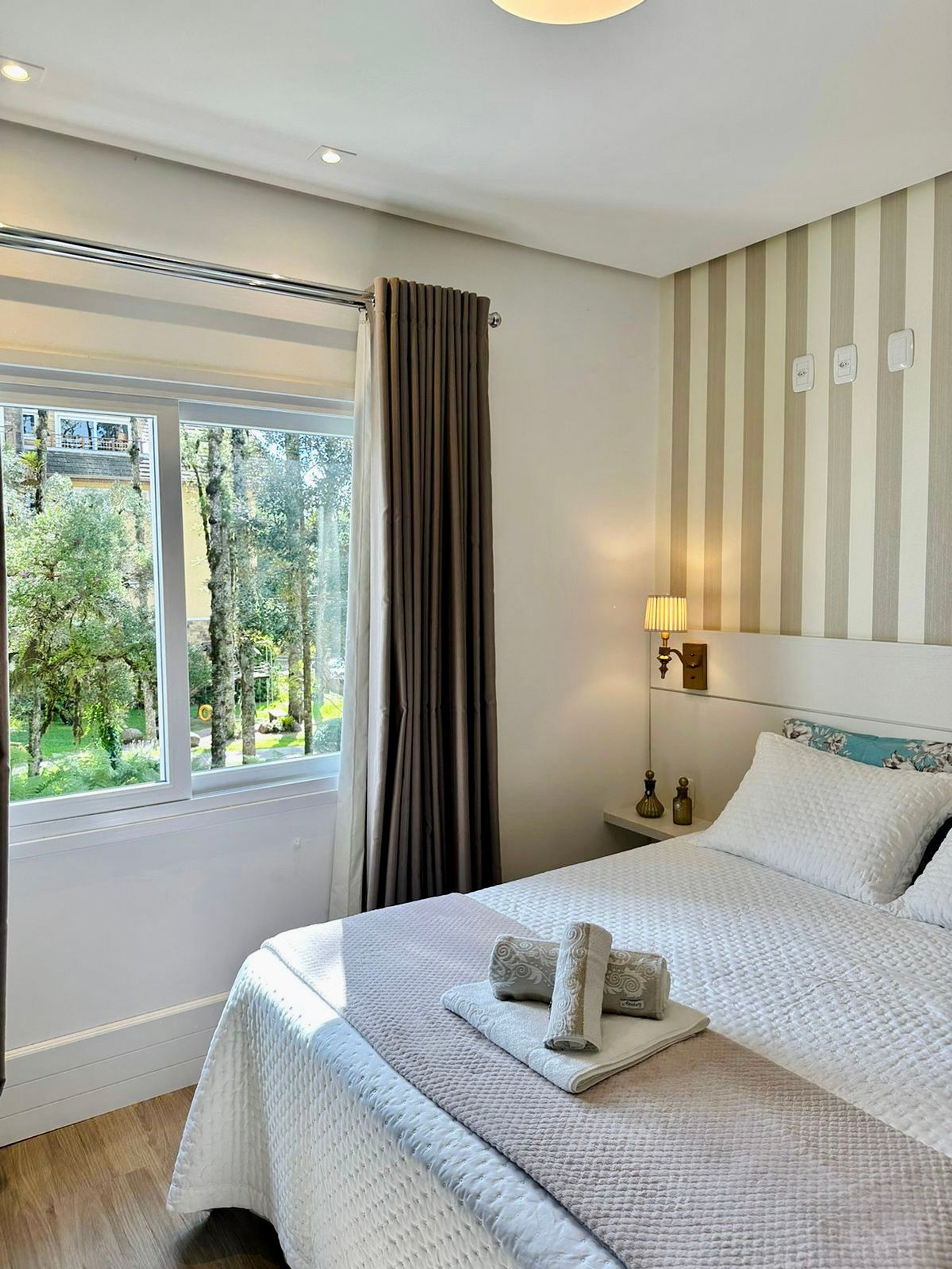 Esse apartamento é espaçoso e acomoda confortavelmente até seis pessoas. São duas suítes, uma com cama de casal tamanho queen e a segunda suíte com cama de casal tamanho padrão. Além disso possui um sofá cama confortável que acomoda mais duas pessoas. O apartamento está totalmente equipado com itens essenciais como louças, roupas de cama e banho, microondas, forno, cafeteira, sanduicheira, secador de cabelo e etc… Aqui, você não precisa se preocupar em carregar todos esses itens extras, pois nós pensamos em tudo! Caso você tenha bebê, temos berço portátil e banheira (mediante solicitação e reserva prévia). Possui ainda ar-condicionado quente e frio em todos os cômodos principais. O Condomínio conta com infraestrutura completa com piscina aquecida, hidro, sauna, lounge, espaço kids, playground, jardim suspenso com chimarródromo e lareira... possui duas vaga de garagem coberta. Você pode contar comigo para montar seu roteiro ou com dicas e sugestões sobre Gramado e Canela. Além disso, estarei à disposição 24h através para qualquer eventualidade.