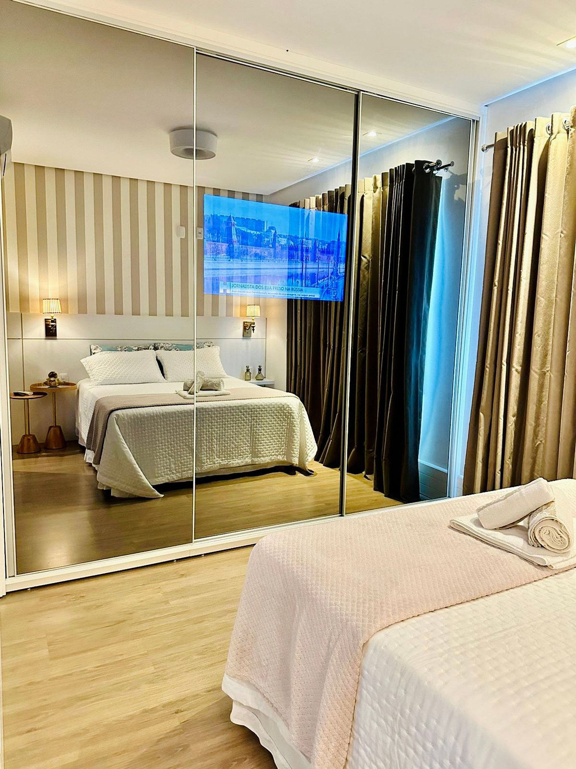 Esse apartamento é espaçoso e acomoda confortavelmente até seis pessoas. São duas suítes, uma com cama de casal tamanho queen e a segunda suíte com cama de casal tamanho padrão. Além disso possui um sofá cama confortável que acomoda mais duas pessoas. O apartamento está totalmente equipado com itens essenciais como louças, roupas de cama e banho, microondas, forno, cafeteira, sanduicheira, secador de cabelo e etc… Aqui, você não precisa se preocupar em carregar todos esses itens extras, pois nós pensamos em tudo! Possui ainda ar-condicionado quente e frio em todos os cômodos principais.