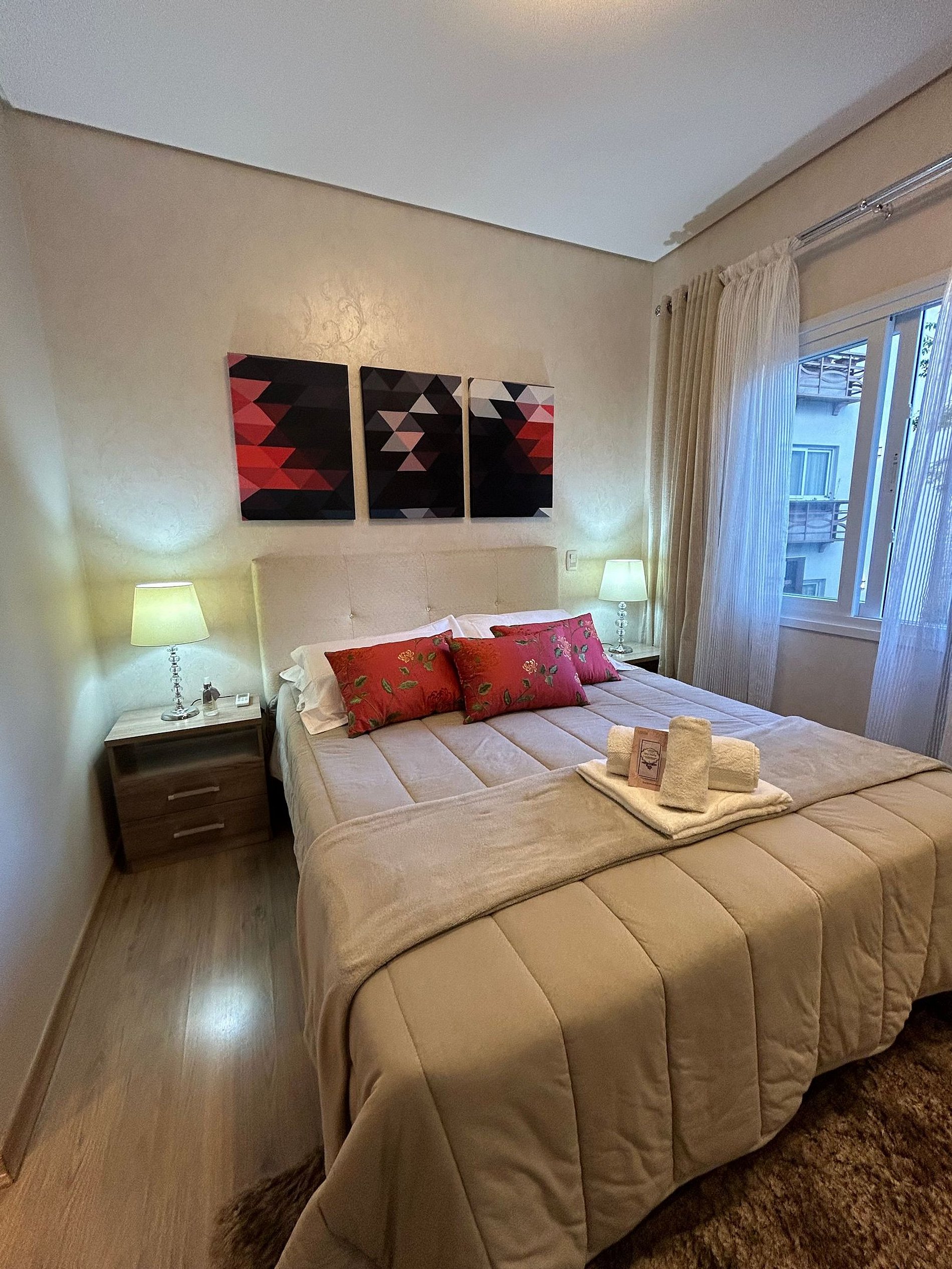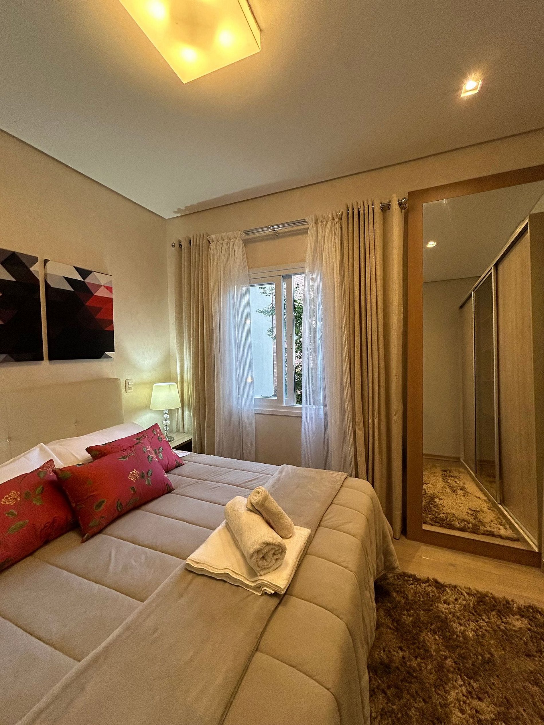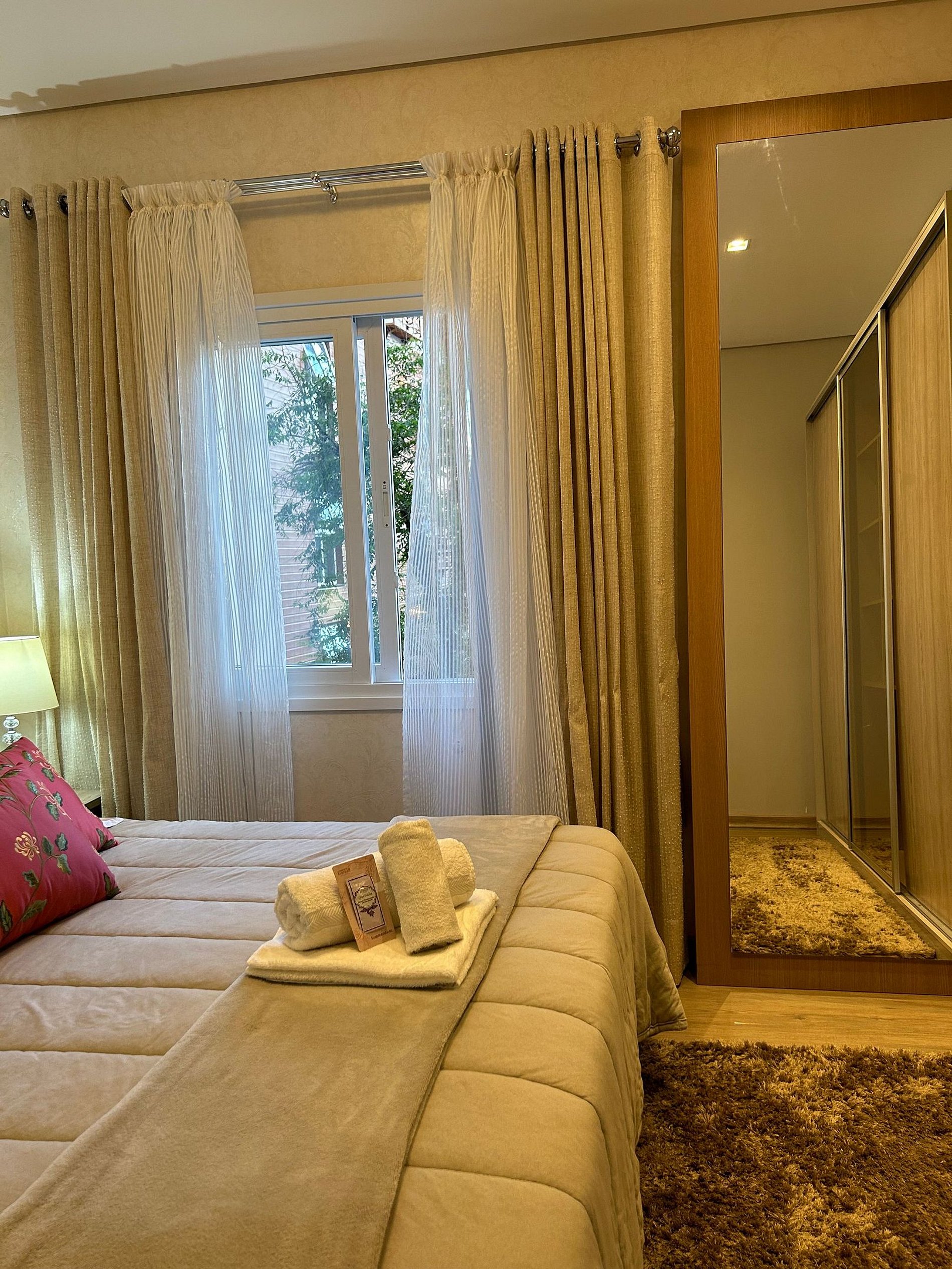 Pensando no seu conforto e descanso o apartamento possui uma suíte equipada com roupas de cama 300 fios, toalhas de banho tamanho gigante, toalhas de rosto e piso de excelente qualidade, além de ar-condicionado Split quente e frio, espelho e guarda roupas para acomodar todos os seus pertences. Você também vai encontrar um ferro de passar roupa e um secador de cabelos. A Sala de estar/jantar é equipada com TV Smart HD, ar-condicionado quente e frio, mesa de jantar com 4 cadeiras, um sofá-cama tamanho casal muito confortável com roupas de cama disponíveis. Na cozinha você encontra bule térmico com coador e filtros disponíveis. Você também terá a disposição uma chaleira elétrica, sanduicheira/grill, microondas, taças de vinho e espumante, geladeira, fogão, louças e talheres, panelas e churrasqueira. Sacada com vista para a Avenida das Hortênsias e vegetação local.