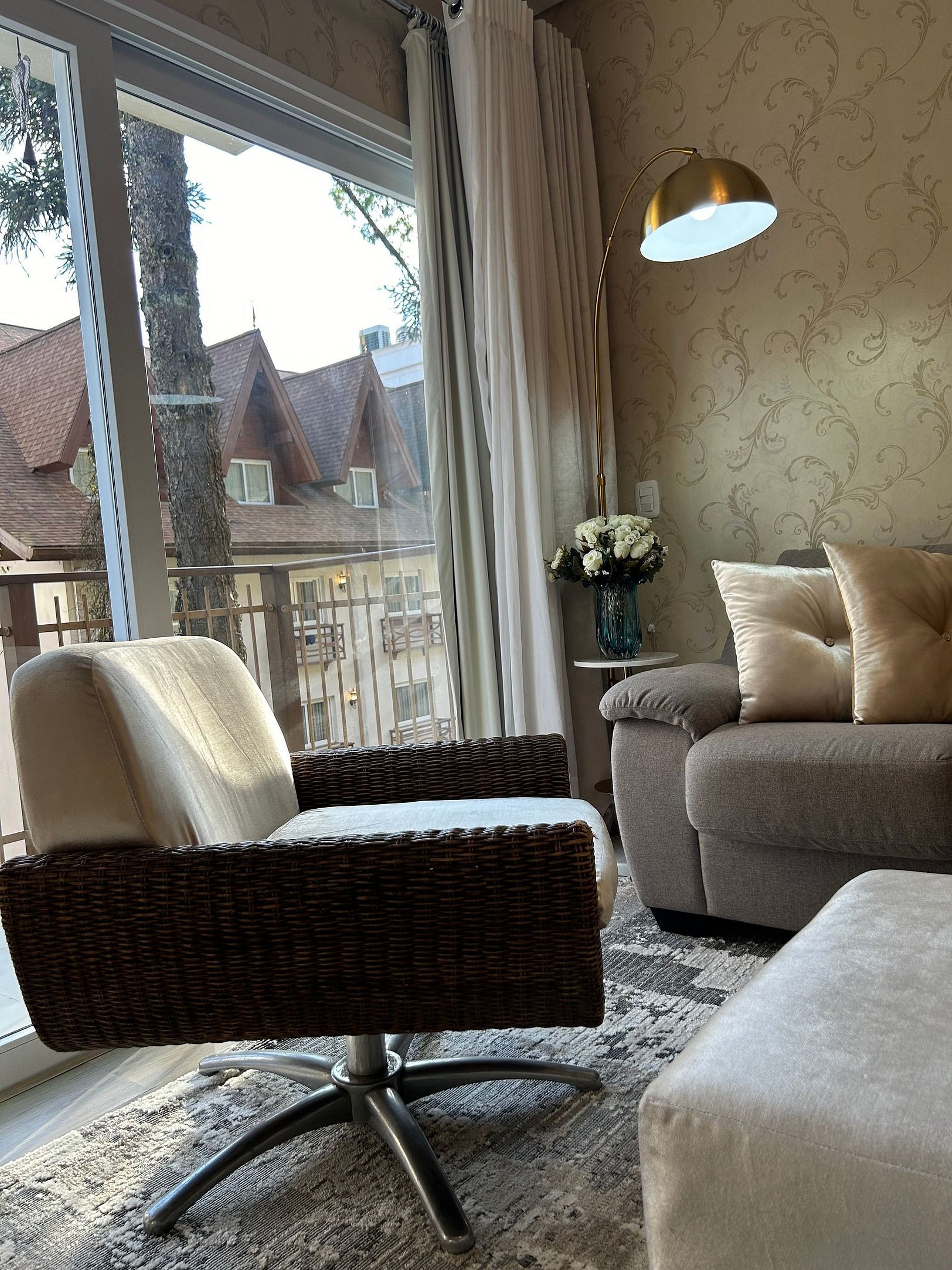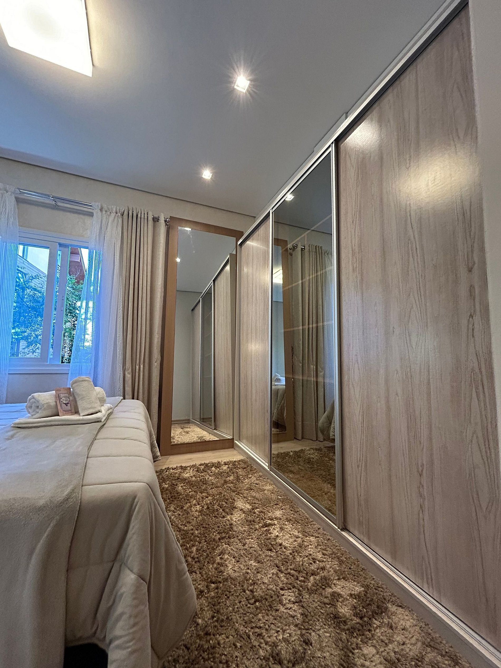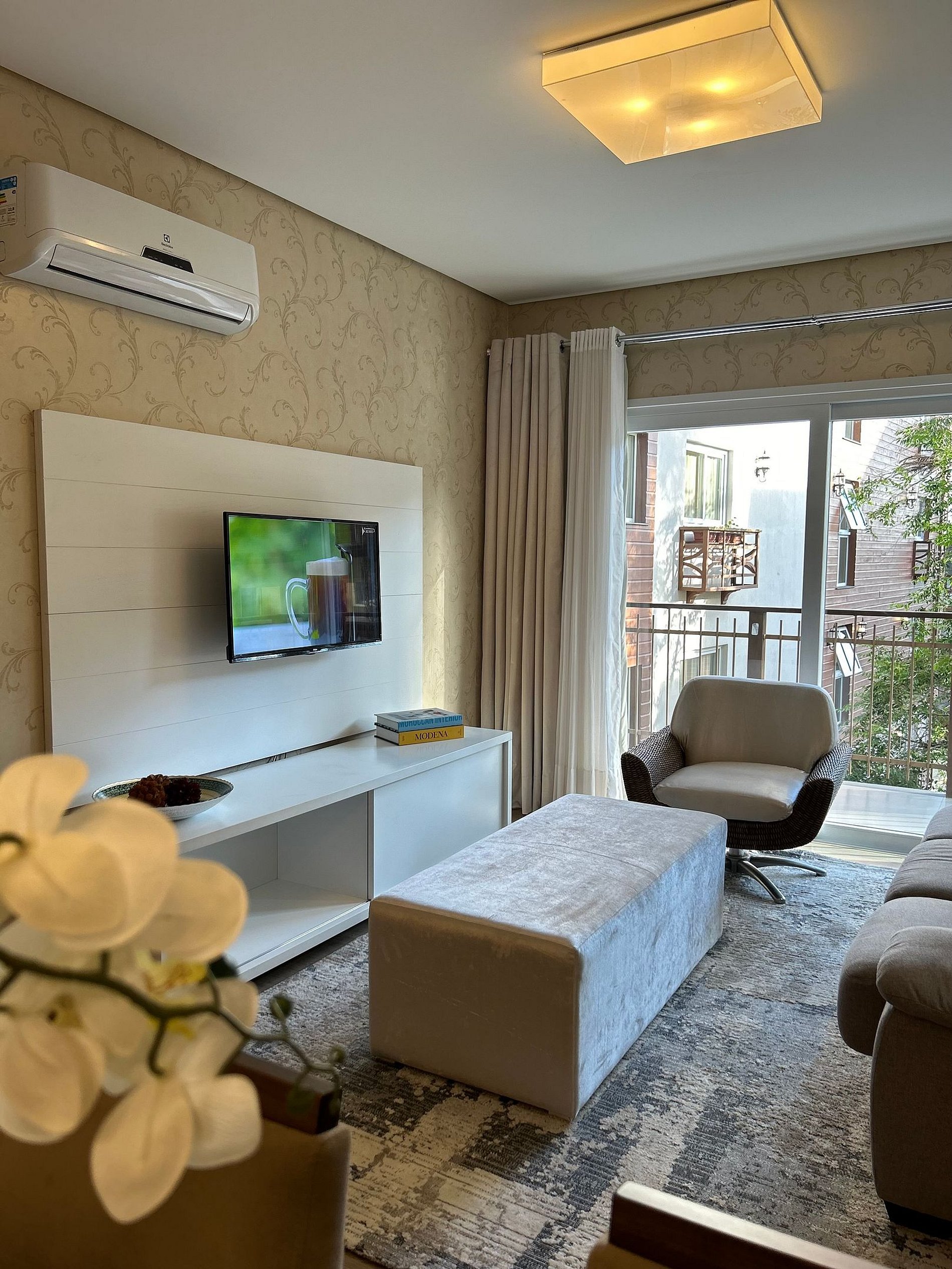 Pensando no seu conforto e descanso o apartamento possui uma suíte equipada com roupas de cama 300 fios, toalhas de banho tamanho gigante, toalhas de rosto e piso de excelente qualidade, além de ar-condicionado Split quente e frio, espelho e guarda roupas para acomodar todos os seus pertences. Você também vai encontrar um ferro de passar roupa e um secador de cabelos. A Sala de estar/jantar é equipada com TV Smart HD, ar-condicionado quente e frio, mesa de jantar com 4 cadeiras, um sofá-cama tamanho casal muito confortável com roupas de cama disponíveis. Na cozinha você encontra bule térmico com coador e filtros disponíveis. Você também terá a disposição uma chaleira elétrica, sanduicheira/grill, microondas, taças de vinho e espumante, geladeira, fogão, louças e talheres, panelas e churrasqueira. Sacada com vista para a Avenida das Hortênsias e vegetação local.
