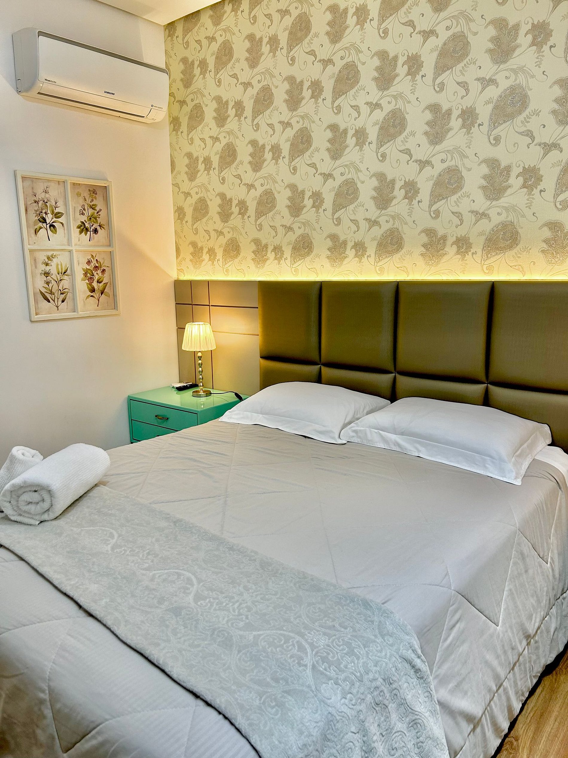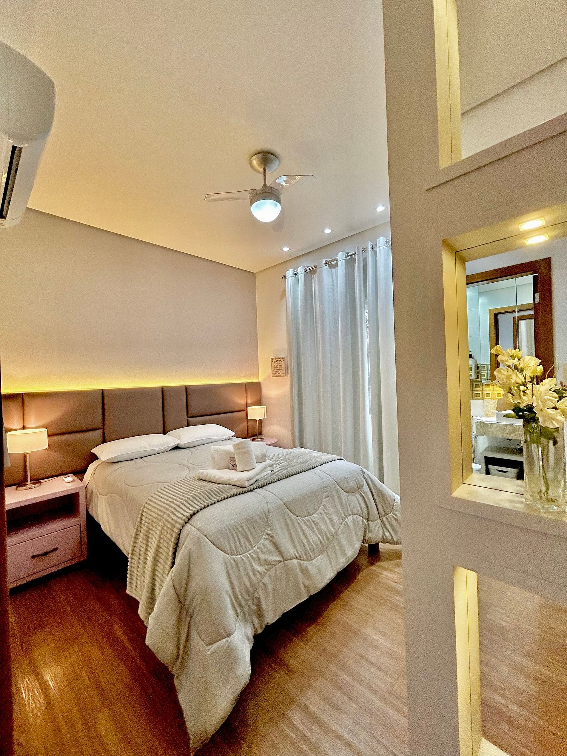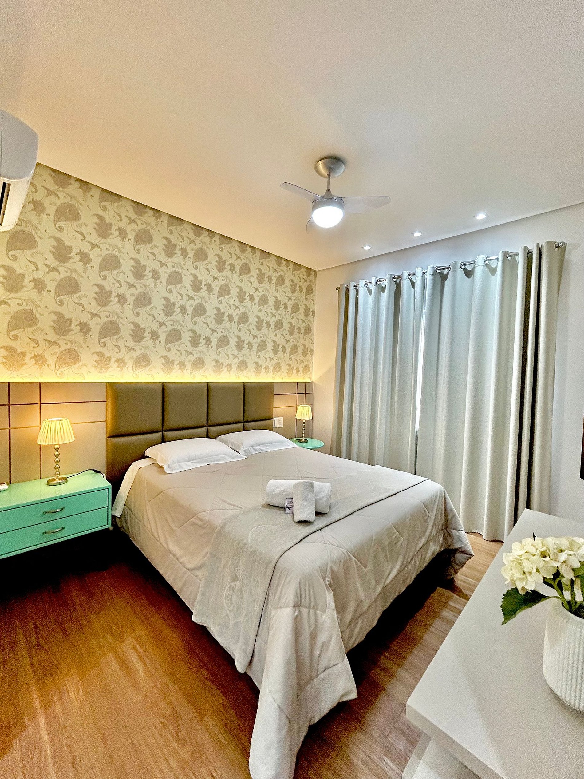 Esse apartamento é espaçoso e acomoda confortavelmente até seis pessoas. São duas suítes, uma com cama de casal tamanho queen e a segunda suíte com cama de casal tamanho padrão. Além disso possui um sofá cama confortável que acomoda mais duas pessoas. O apartamento está totalmente equipado com itens essenciais como louças, roupas de cama e banho, microondas, forno, cafeteira, sanduicheira, secador de cabelo e etc… Aqui, você não precisa se preocupar em carregar todos esses itens extras, pois nós pensamos em tudo! Possui ainda ar-condicionado quente e frio em todos os cômodos principais.