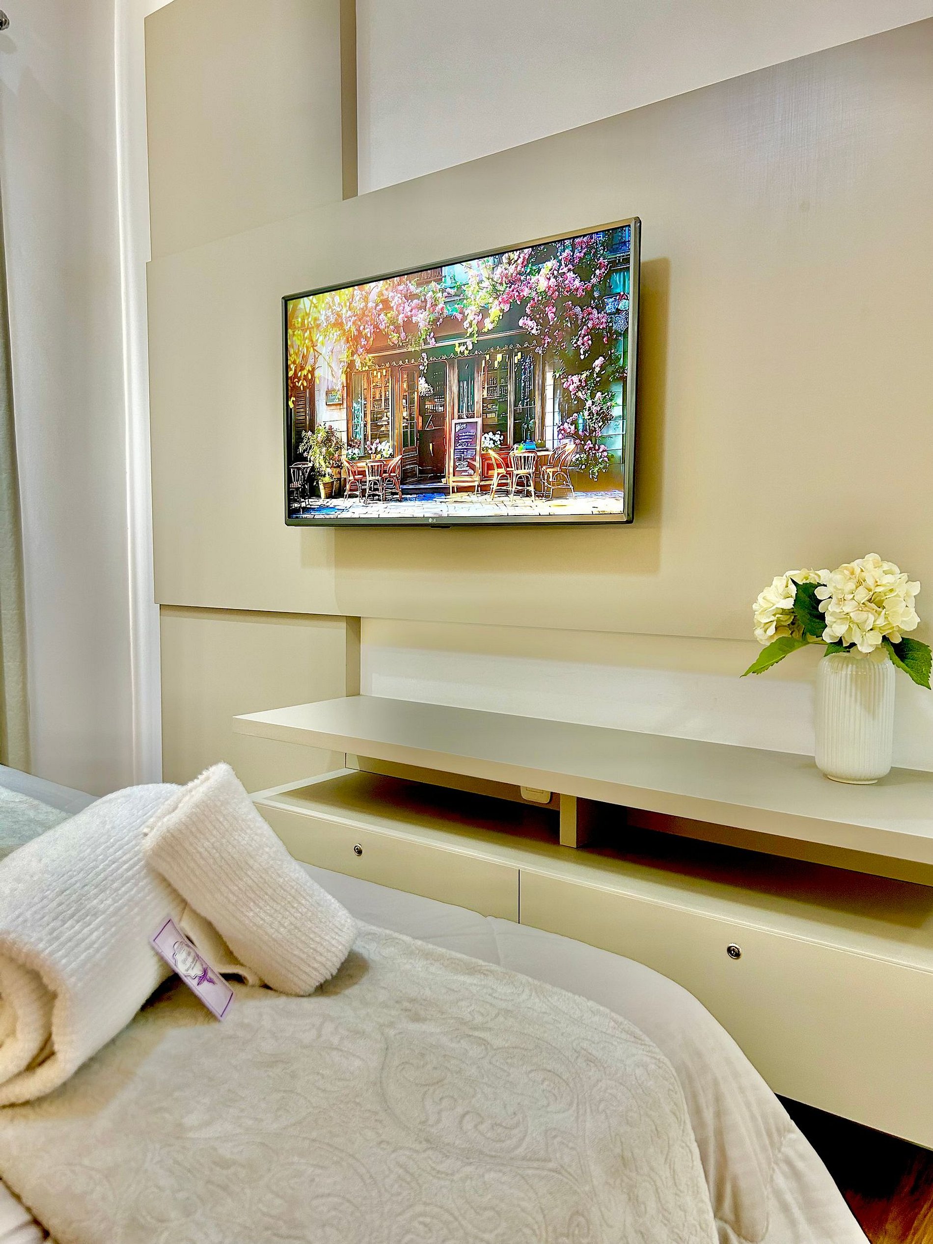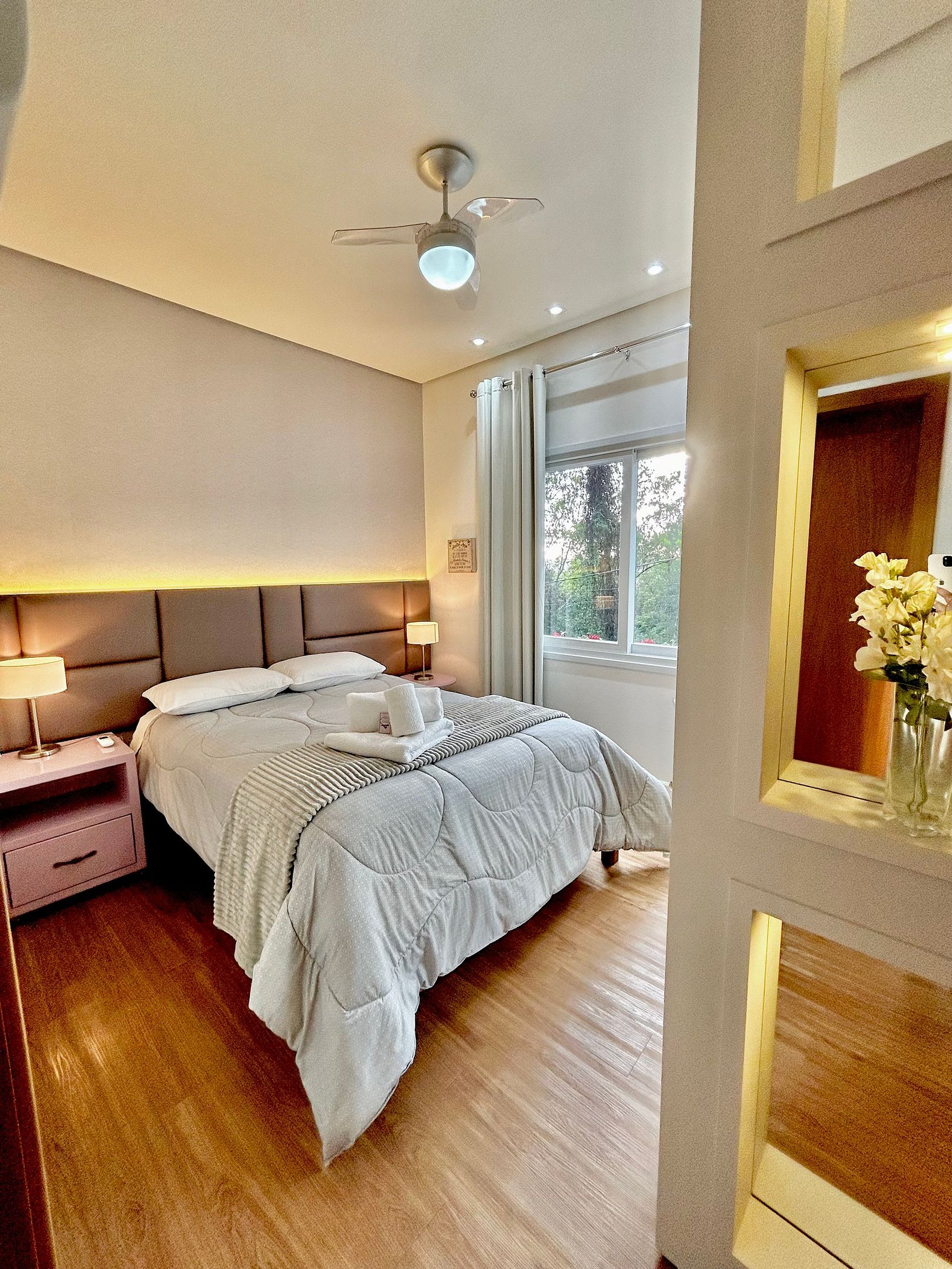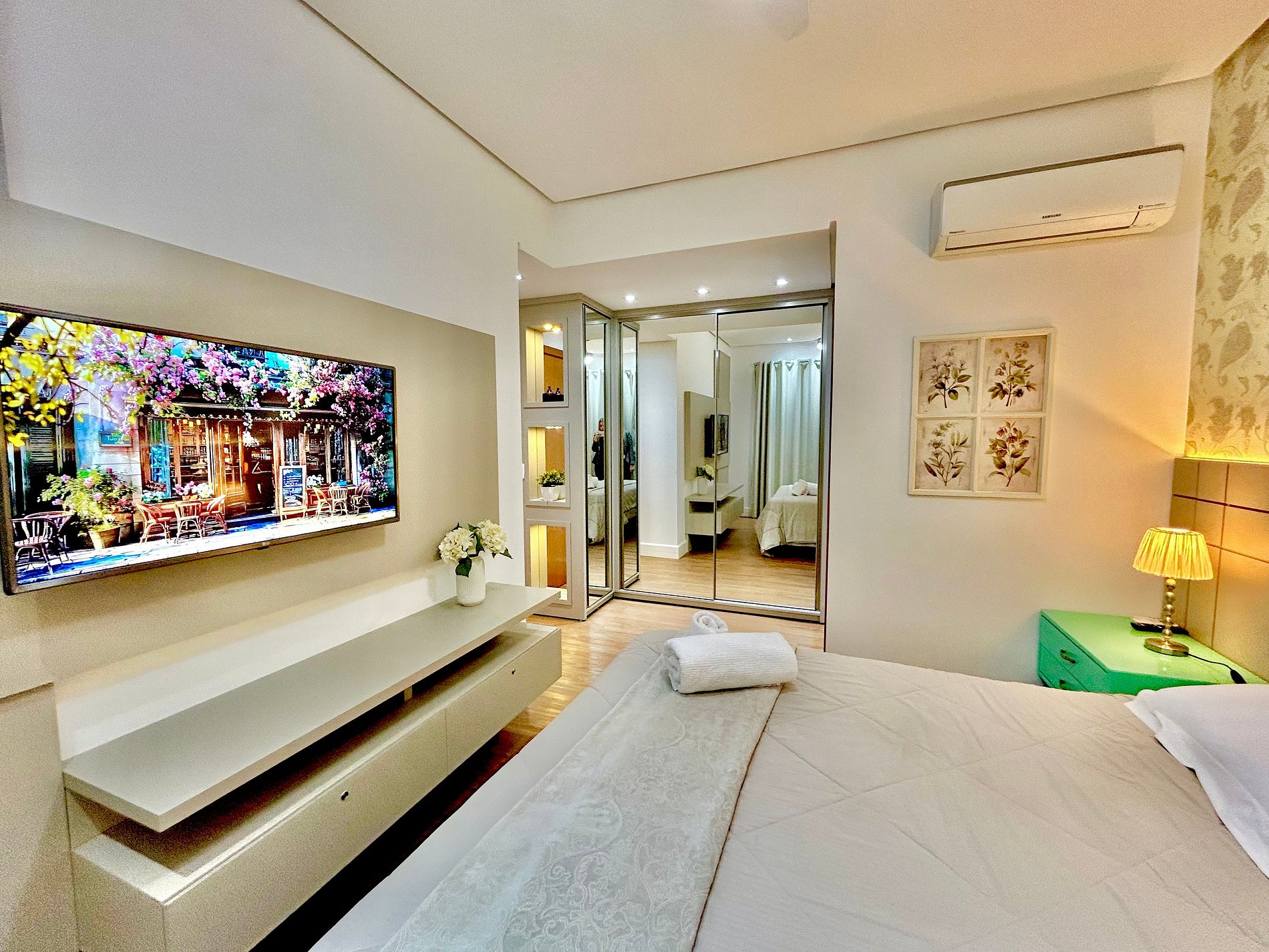Esse apartamento é espaçoso e acomoda confortavelmente até seis pessoas. São duas suítes, uma com cama de casal tamanho queen e a segunda suíte com cama de casal tamanho padrão. Além disso possui um sofá cama confortável que acomoda mais duas pessoas. O apartamento está totalmente equipado com itens essenciais como louças, roupas de cama e banho, microondas, forno, cafeteira, sanduicheira, secador de cabelo e etc… Aqui, você não precisa se preocupar em carregar todos esses itens extras, pois nós pensamos em tudo! Possui ainda ar-condicionado quente e frio em todos os cômodos principais.
