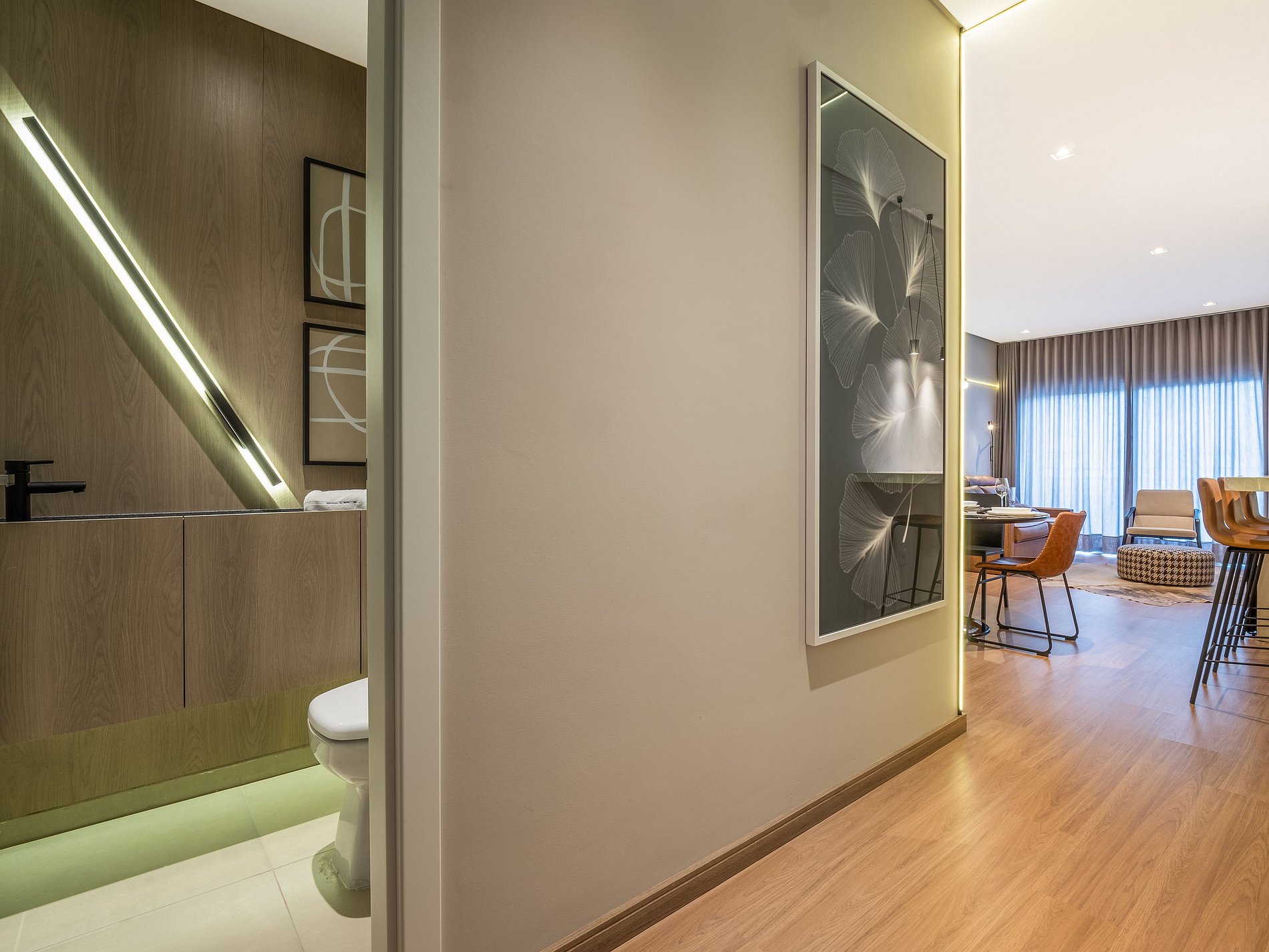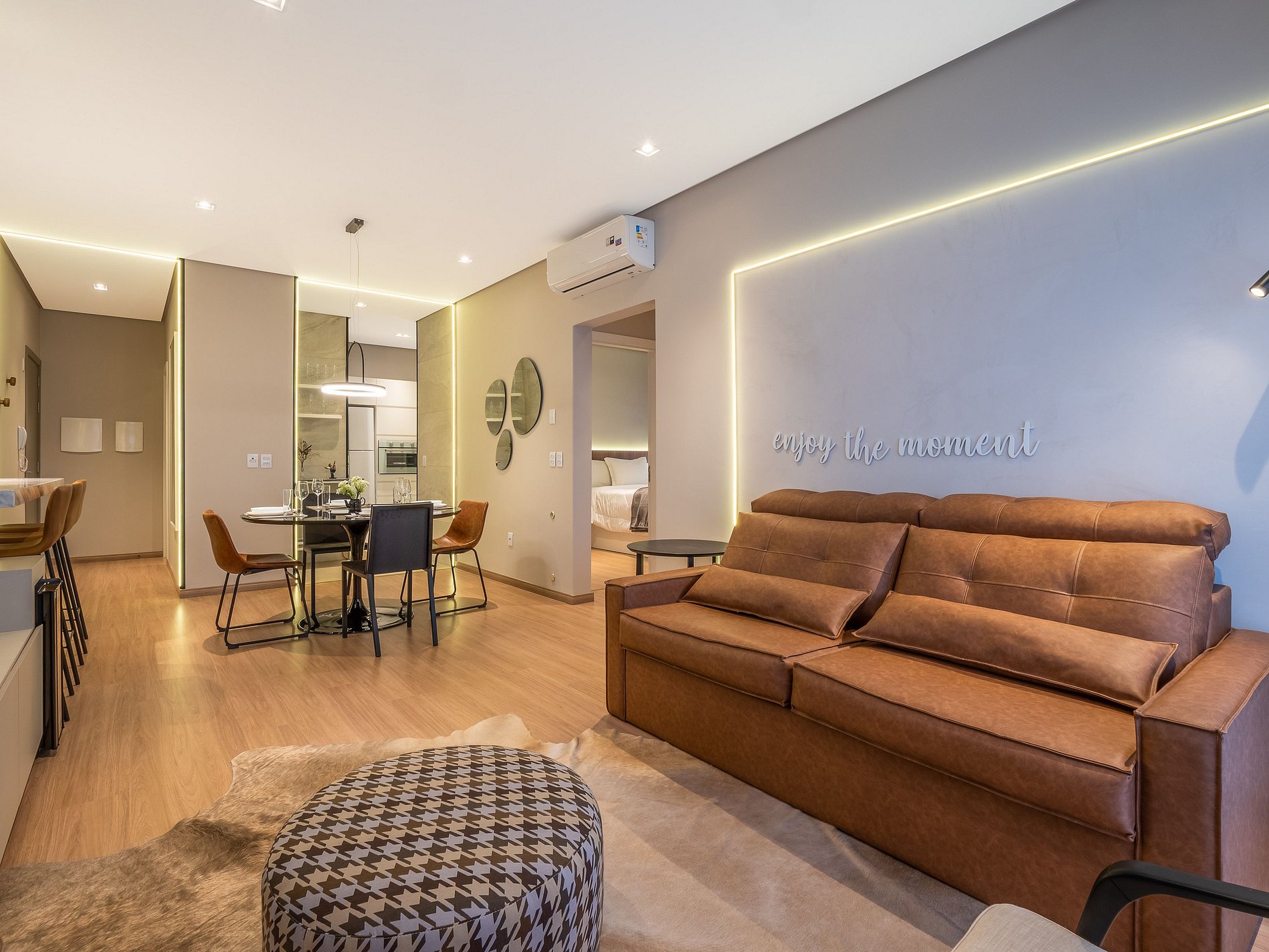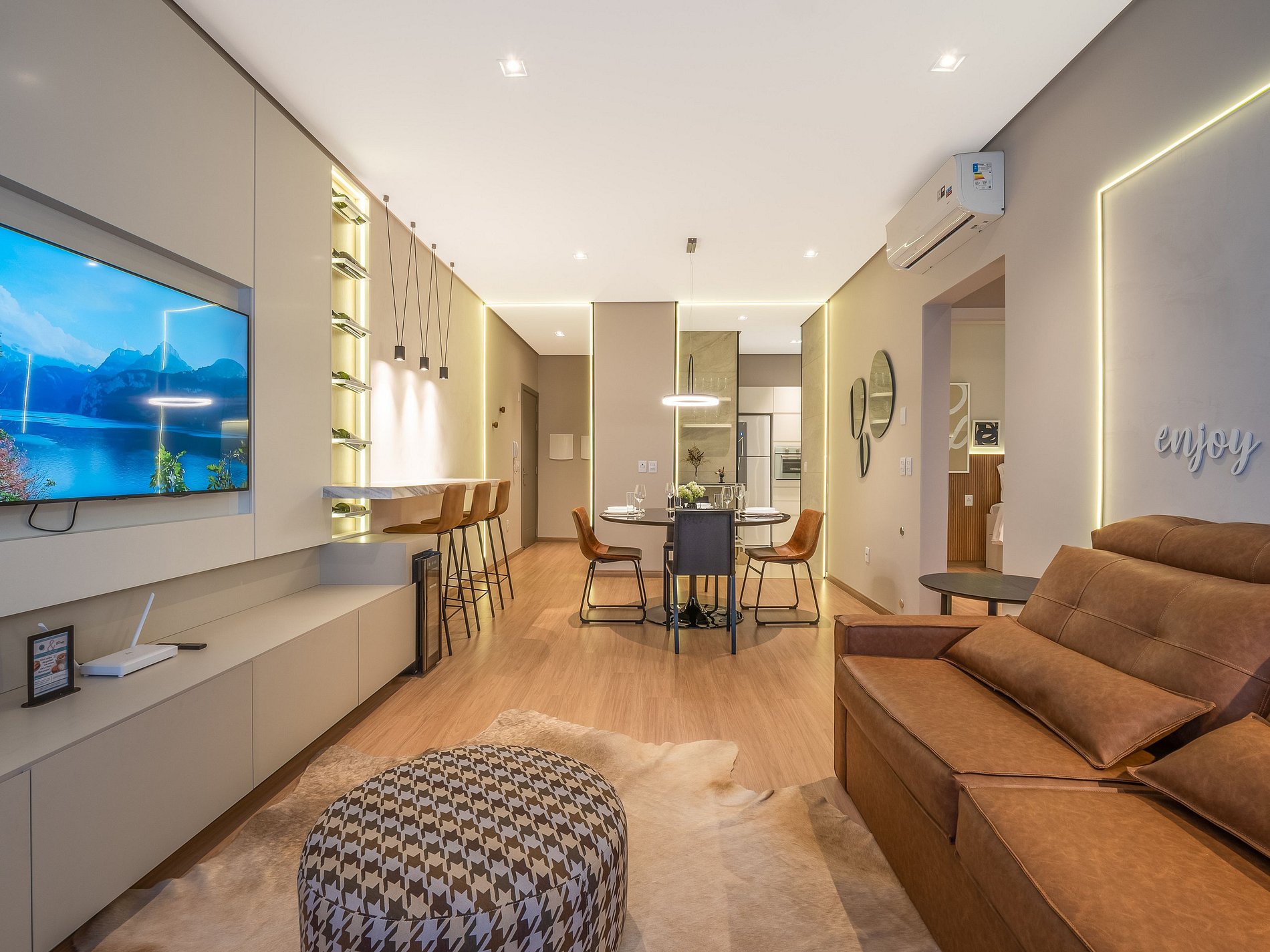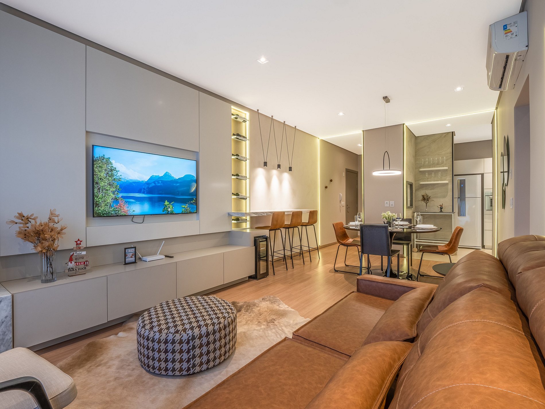 Com capacidade para até 7 pessoas, o espaço conta com duas suítes climatizadas (uma com cama queen e outra com cama de casal + auxiliar), sofá-cama na sala e um lavabo adicional. A decoração moderna e os acabamentos de alto padrão garantem conforto e sofisticação em todos os ambientes.