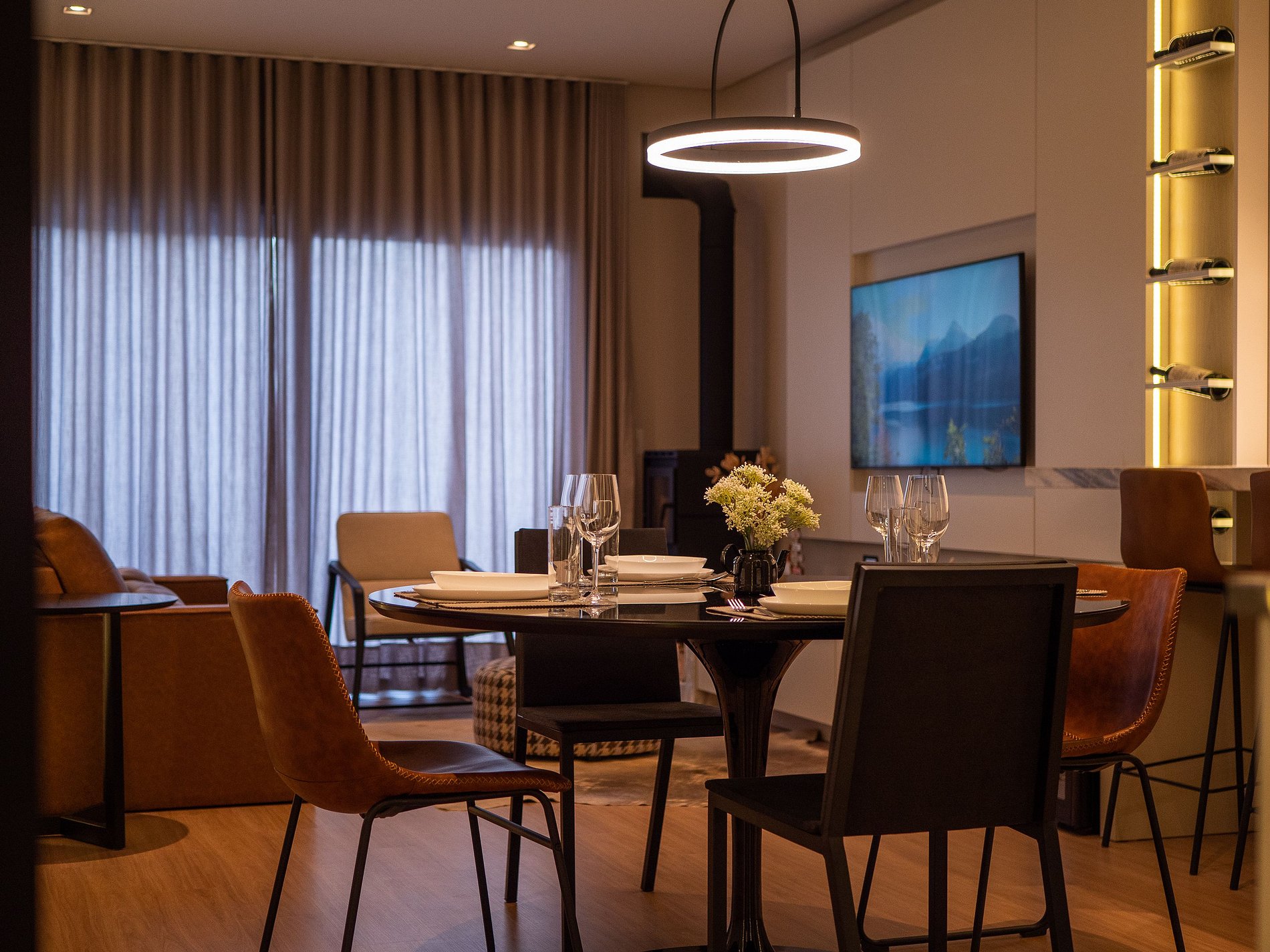 A lareira na sala cria uma atmosfera perfeita para os dias frios de Gramado — ideal para um vinho à noite, um bom livro ou um tempo de qualidade em família. A cozinha é completa, com utensílios de excelente qualidade e itens para churrasco, oferecendo liberdade e praticidade durante a estadia.